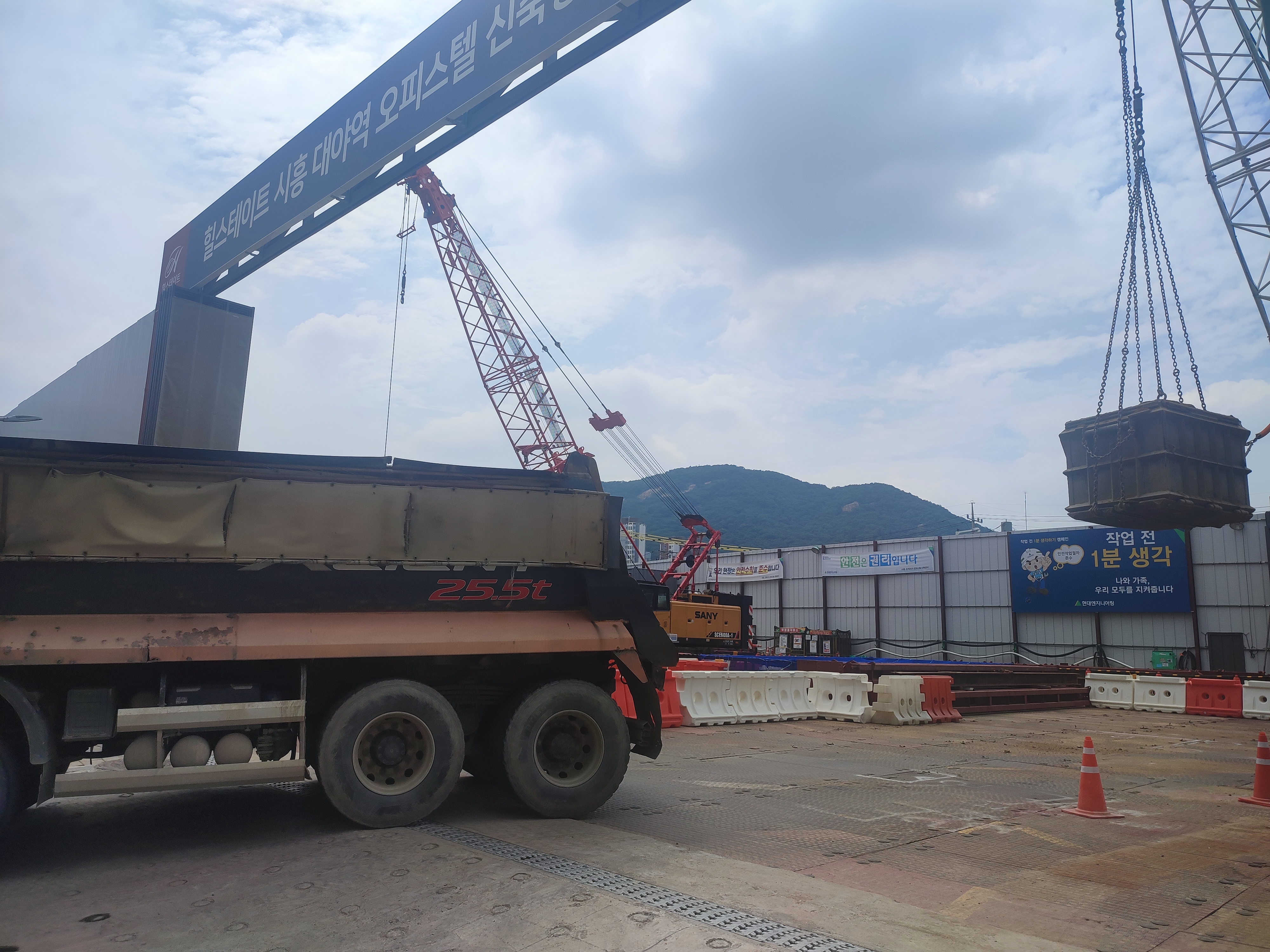 현장에 덤프트럭이 계속 폐기물을