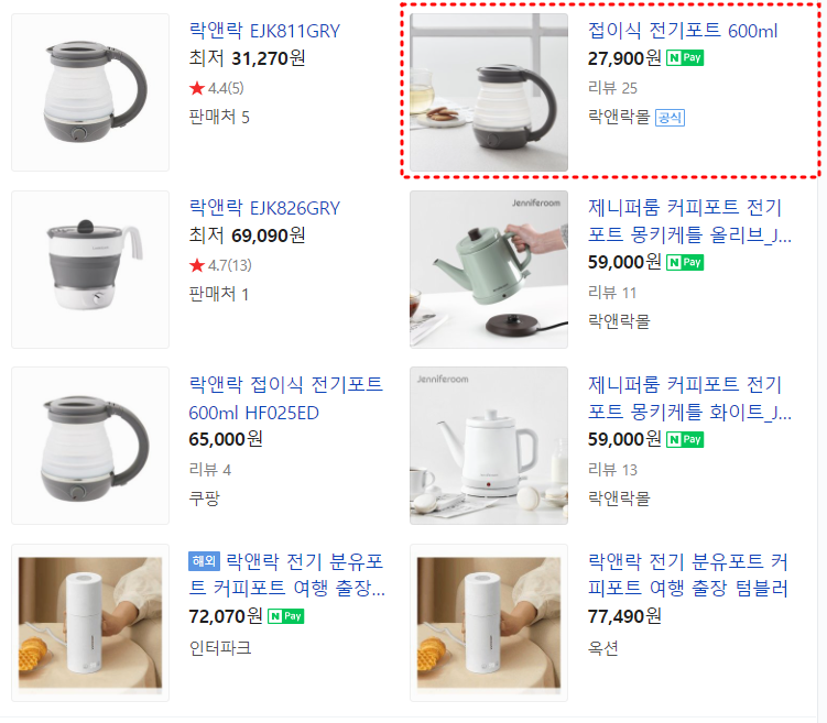 이왕이면 브랜드로 구입하자고 마음먹고 락앤락 접이식 전기포트를 구입했습니다.