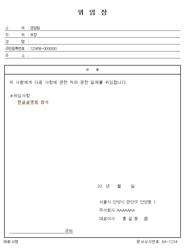 하다보면 공사건이라든지 법원에 소송을 진행할 경우 등등 외부적으로 회사일을 처리할때 회사에서 직원에 모든 권한일체를 위임한다라는 내용의 위임장을 작성하게 됩니다.